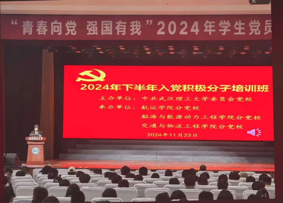 11月23日,学校2024年第8期入党积极分子培训班在余家头校区大学生活动中心举行。本期培训班由必赢3003no1线路检测中心分校、船海与能源动力工程学院分校、交通与物流工程学院分校联合承办,385名学员参加。培训班由必赢3003no1线路检测中心组织员刘颖主持。