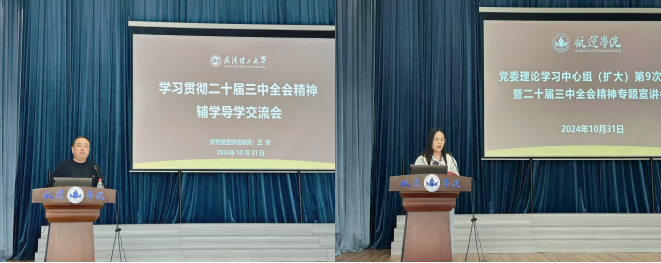 2024年10月31日下午,学院在天象馆一楼报告厅召开党委理论学习中心组(扩大)第9次集体学习暨二十届三中全会精神专题宣讲会,邀请校党委宣讲团成员、艺设学院王军教授作专题辅导报告。学院班子成员、党委委员、纪委委员、机关工作人员、系(中心)科室主任、教工党支部委员、教师代表、学生代表参加会议。党委书记侯俊主持会议。